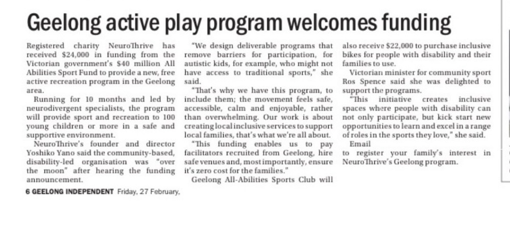 NeuroThrive Australia featured in the Geelong Independent following funding through the Victorian Government’s All Abilities Sport Fund to support inclusive active play programs for neurodivergent children in Geelong.